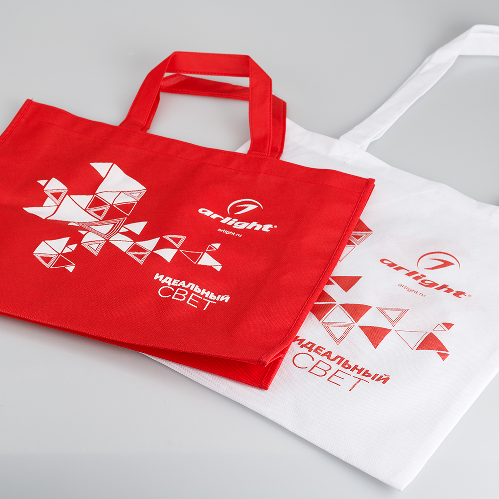 Сумка белая 38*38см, длинные ручки 29см. Персонализация: двухстороннее нанесение, русский+английский (логотип arlight, фирменный элемент "а", сайт www.arlight.ru). Материал - нетканый полипропилен. Для грузов до 10кг.